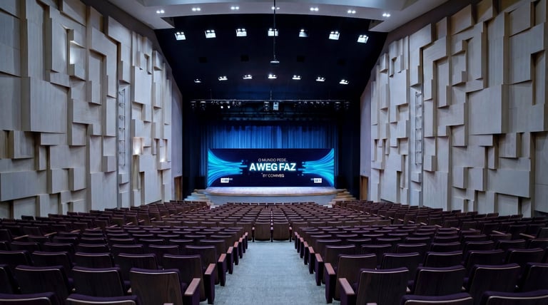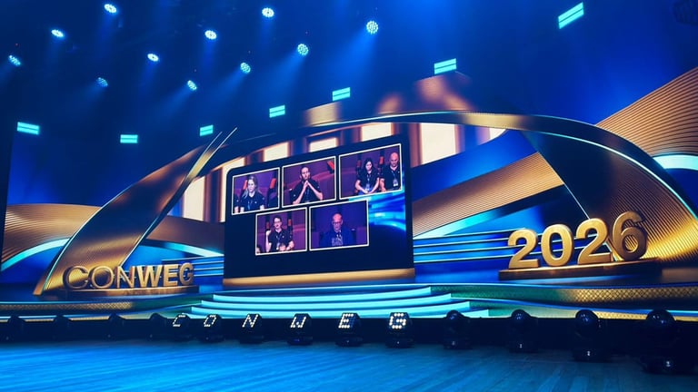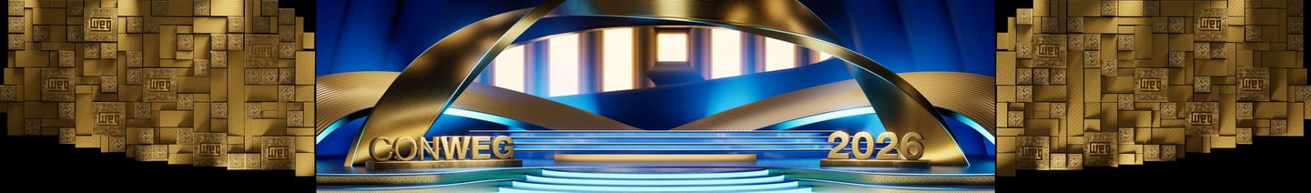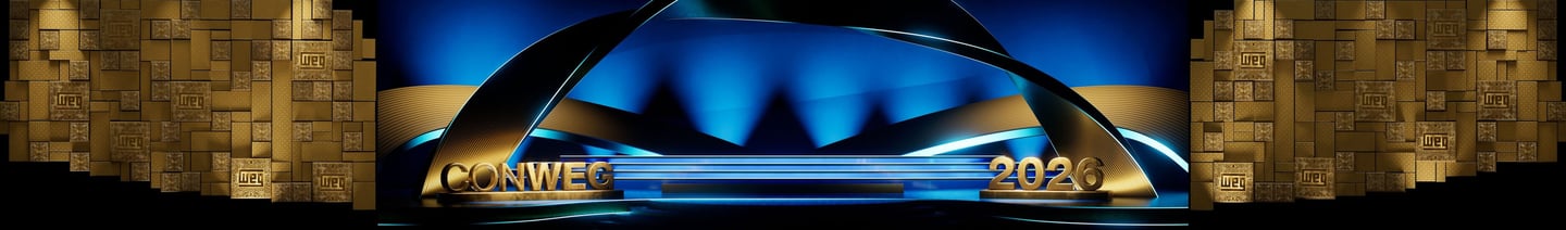 Em 2026, colaboramos com a equipe da WEG na produção do palco da 61ª Conweg. Além do desenvolvimento do palco, criamos animações que compuseram as laterais do vídeo de revelação da premiação.